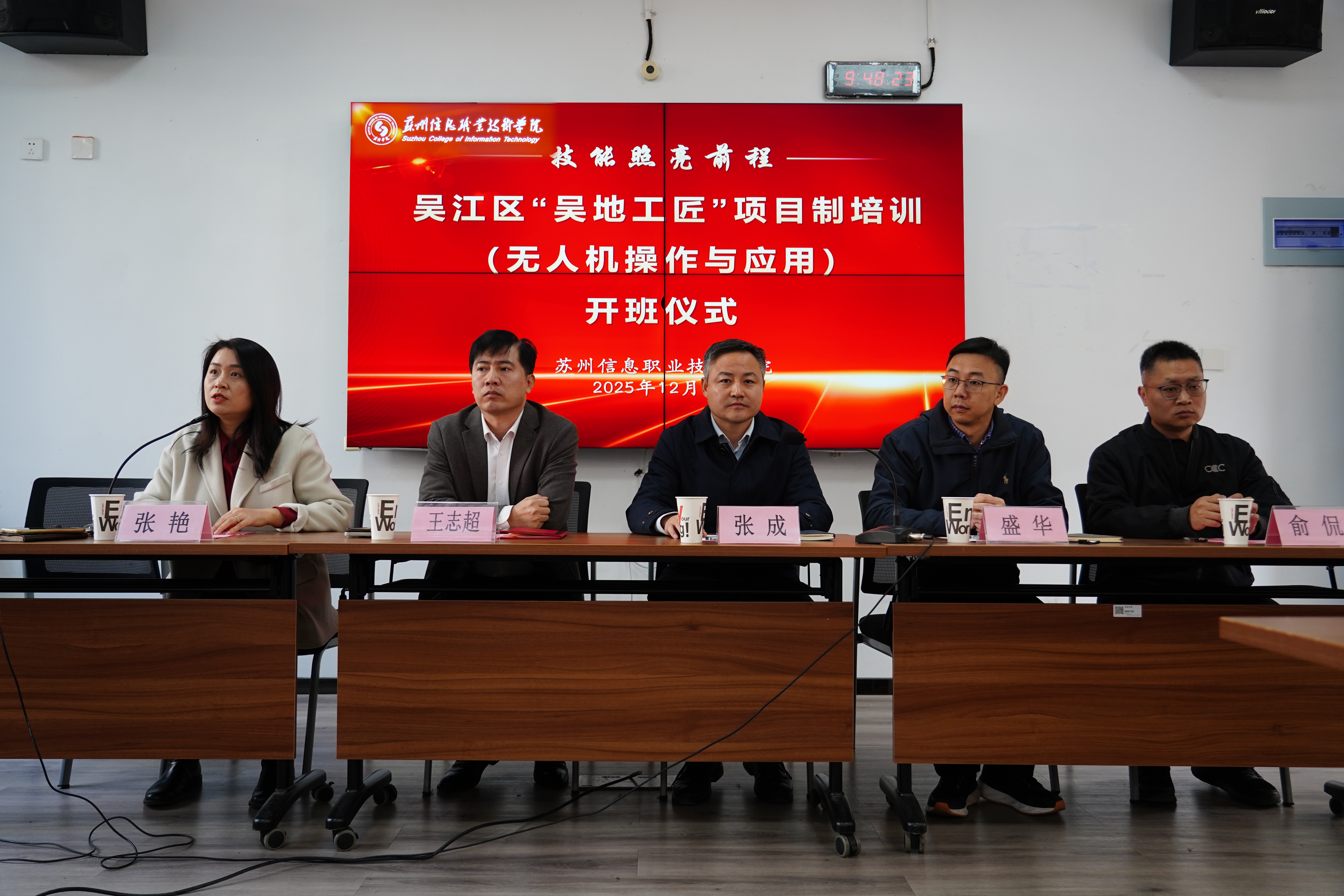 12月1日,2025年吴江区“吴地工匠”项目制培训(无人机操作与应用)在我院正式开班。我院党委委员、副院长张成,苏州市高级人才太湖培训中心(苏州江村学院)培训部主任盛华,苏州航家航空科技发展有限公司党支部书记、总经理王志超,我院通信与信息工程系、继续教育学院负责同志,培训班任课教师、全体学员参加开班仪式。