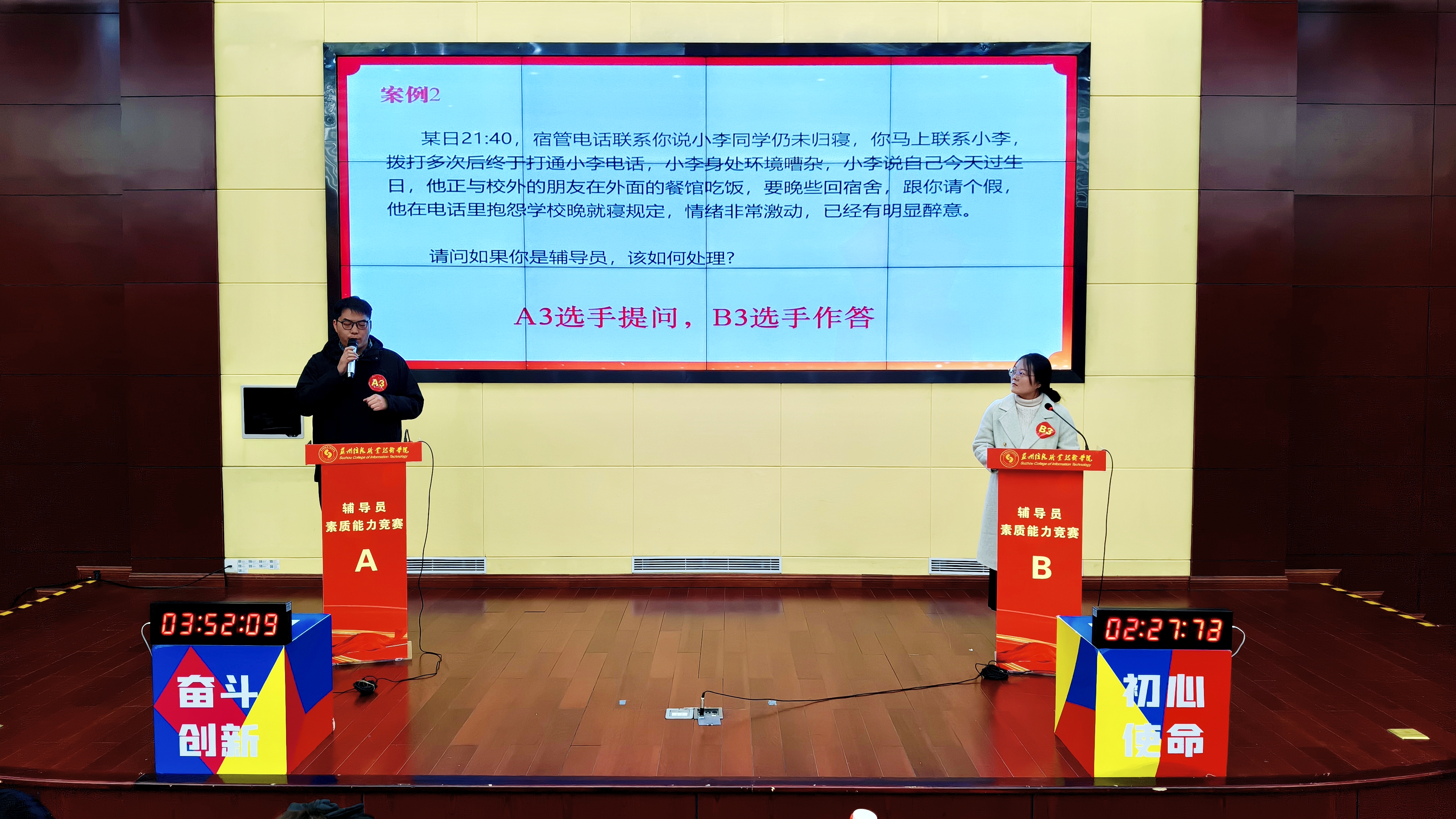 “案例研讨”环节采用“AB角问答”的形式,两名辅导员先后围绕两个复杂案例,通过“你问我答、相互追问”的方式进行交互式研讨。双方共同辨析问题本质、探讨育人规律、提出解决方案,精彩展现了辅导员的理论应用能力、逻辑思维与协同应变水平。