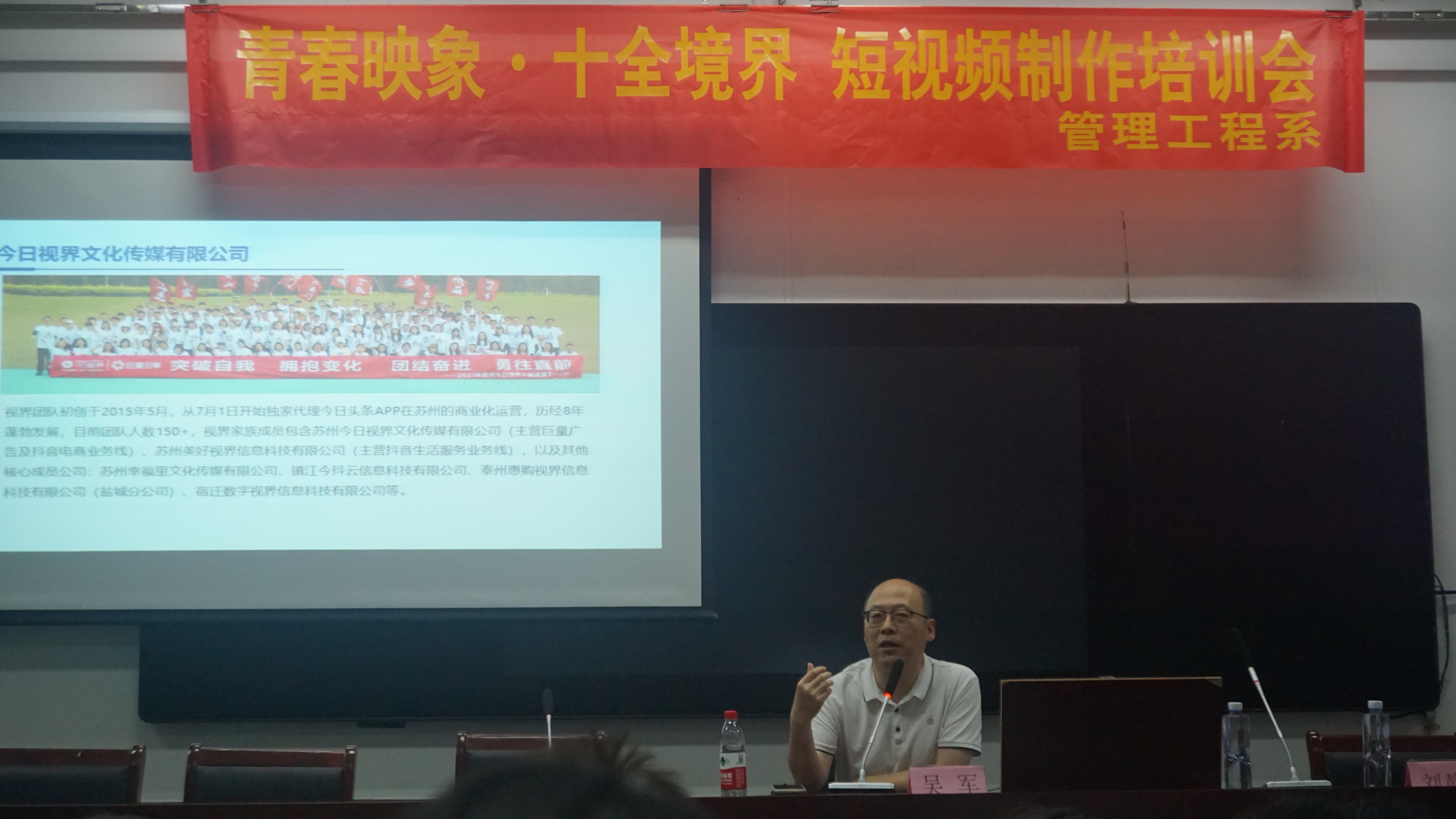 培训紧扣当下短视频的热潮,以提升拍摄技巧、展现青春风采为目标,邀请到了江苏今日世界高级运营总监吴军老师以及抖音百万粉丝博主刘静芸老师。吴老师主要为同学们介绍了目前短视频创作的市场环境、运营的要点等内容。刘老师则从基础入门开始,详细介绍了短视频的基本概念和制作流程,帮助大家快速上手,掌握短视频制作的精髓。在拍摄设备与基础设置方面,刘老师详细讲解了不同设备的优缺点及参数调整方法。他引导学生们根据自身需求选择合适的工具,让每个人都能在实践中找到最适合自己的拍摄方式。