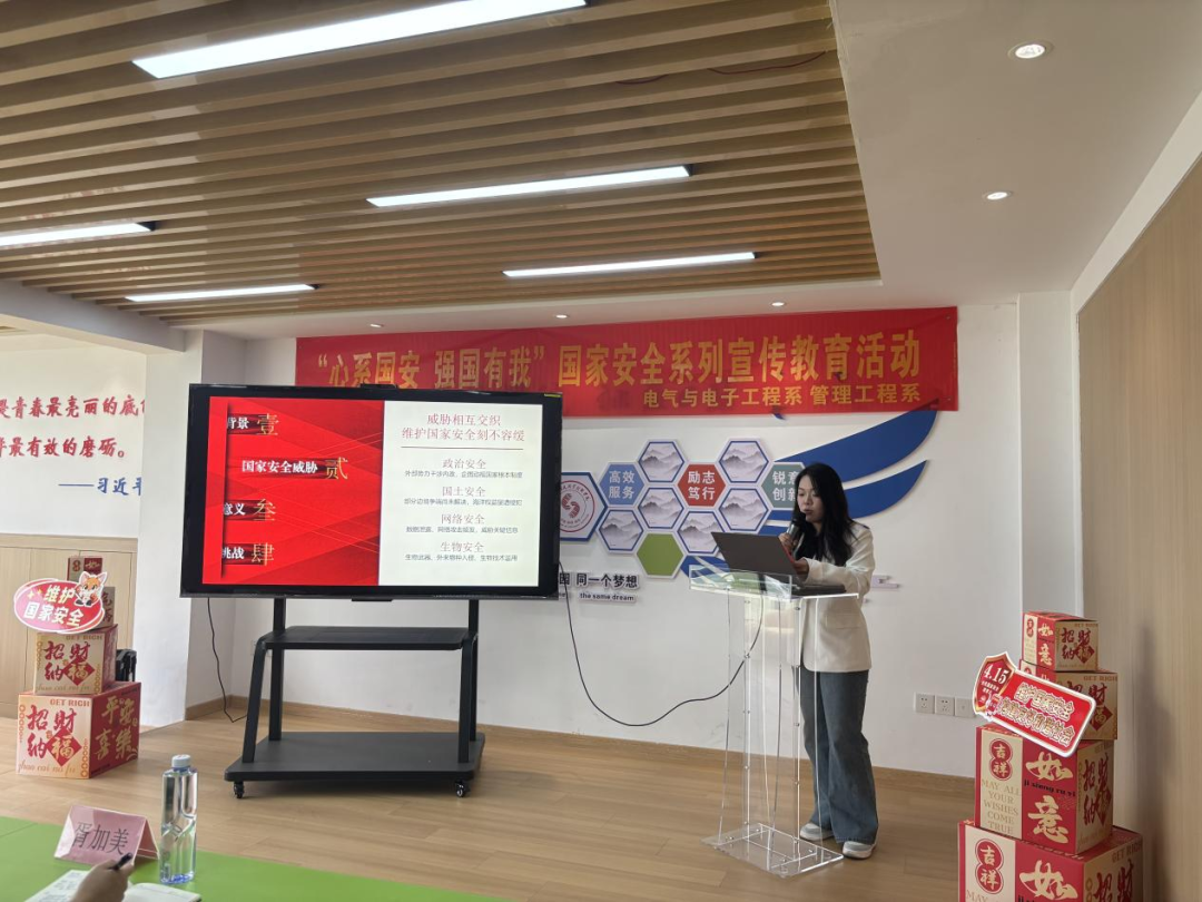 为深入贯彻落实习近平总书记关于全面加强国家安全教育的重要指示精神,推进国家安全法治宣传教育走深走实,深刻领会总体国家安全观的核心要义,2025年4月17日,电气与电子工程系、管理工程系联合举办了“心系国安 强国有我”国家安全系列宣传教育主题团日活动,学院院长陈德斌、电气与电子工程系党支部负责人胥加美、管理工程系党支部副书记芮明华及相关师生代表共同参与。