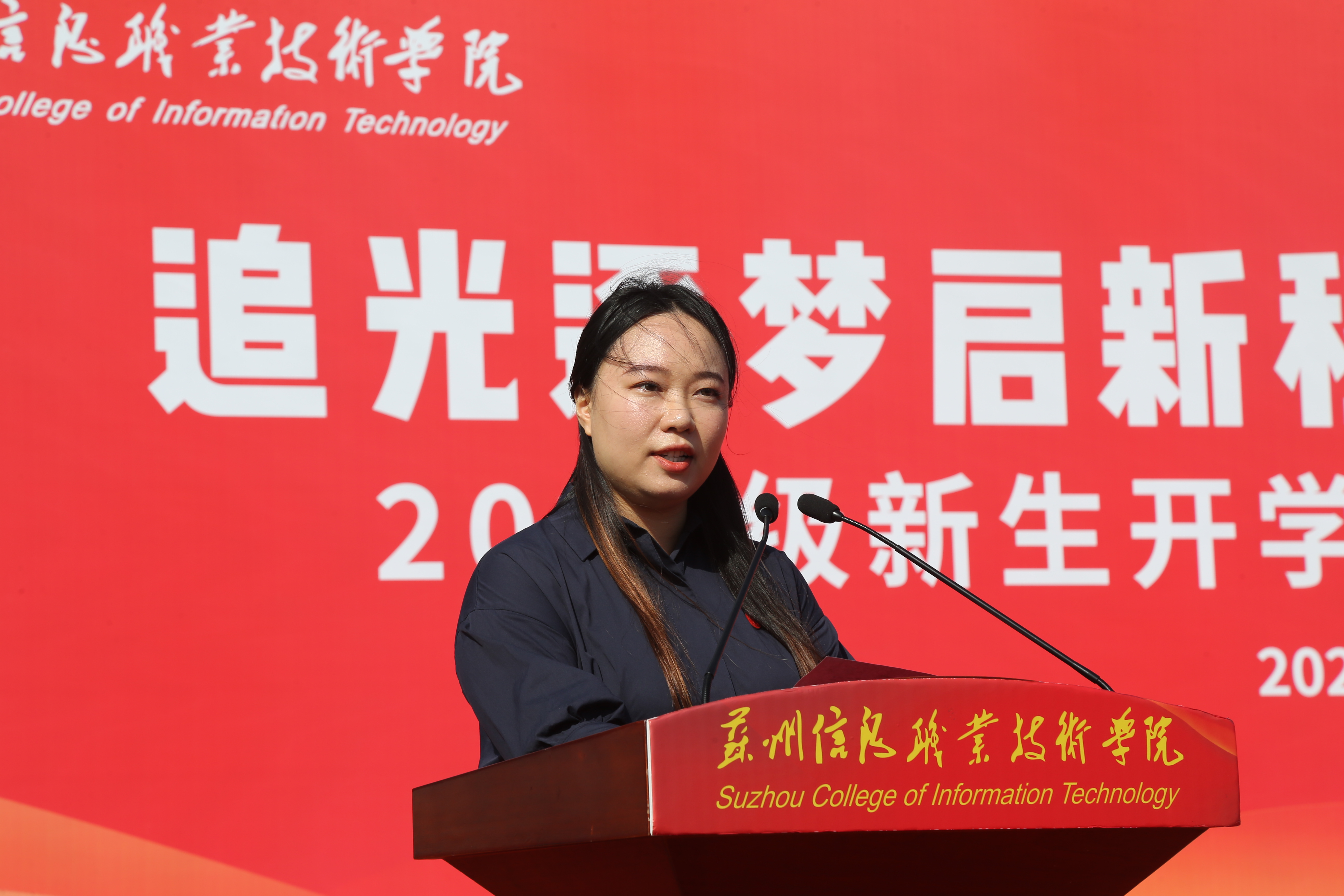 大数据与互联网系辛姝老师,代表学院全体教职工发言,她鼓励新同学,志存高远,脚踏实地,用汗水浇灌理想,用实干铸就未来;勤学善思,练就本领,既要掌握专业知识,更要练就过硬技能;修身立德,健全人格,积极参与校园活动,恪守学术道德;勇于探索,敢于创新,在实践中激发潜能,在创新中实现突破,书写属于自己的精彩华章。