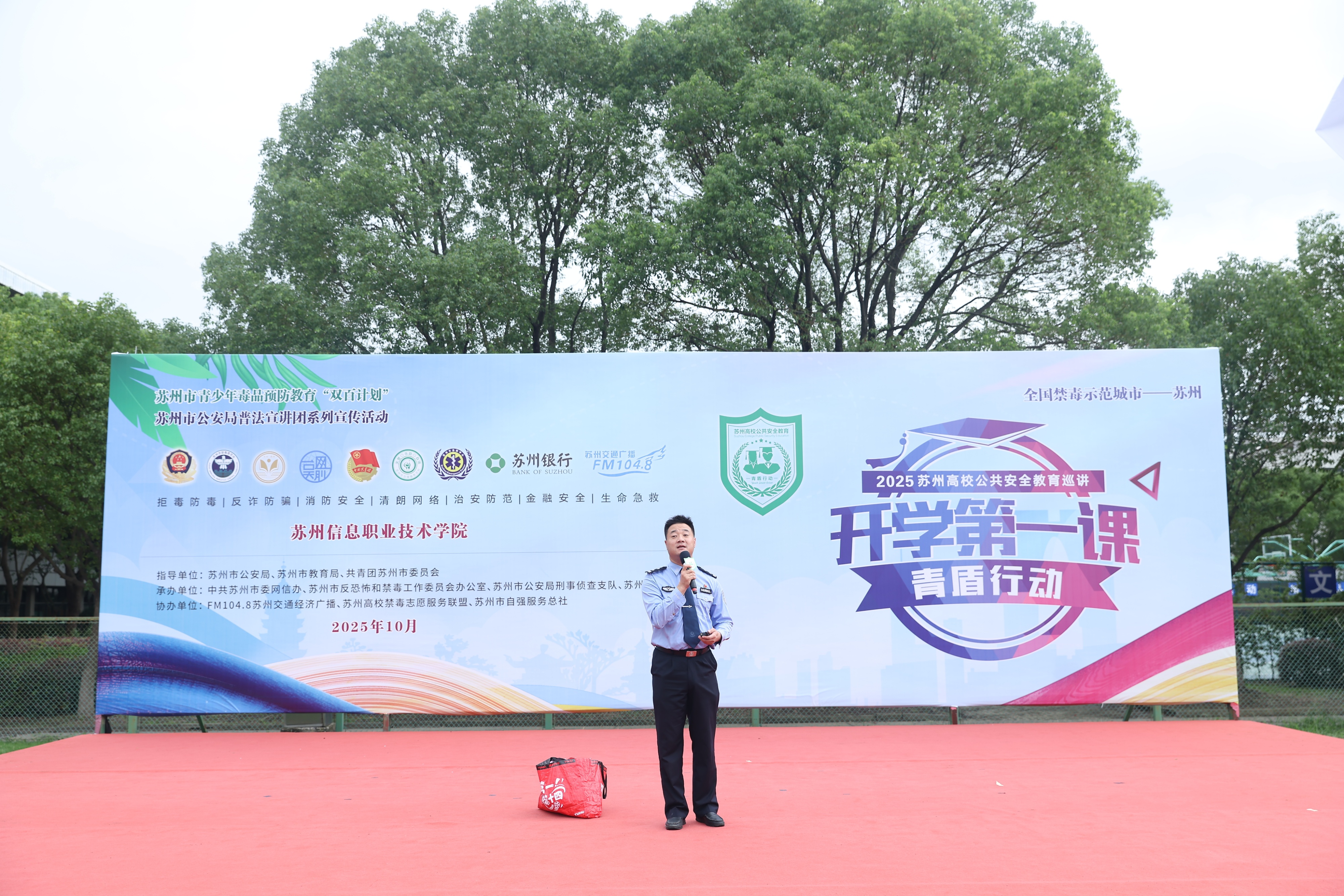 10月16日下午,2025年“青盾行动”苏州高校公共安全教育“开学第一课”闭幕仪式在我院举行。活动由苏州市公安局、市教育局、团市委指导,我院联合市禁毒办等单位承办。我院党委委员、副院长张成,市禁毒办负责同志,我院后勤处(安保处)、学生工作处、各系学生工作负责同志、新生辅导员及2025级全体新生参加活动。